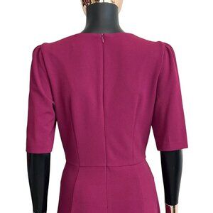 This flattering fit-and-flare silhouette features a soft stretch fabric that moves gracefully, a feminine V-neckline, short sleeves with slight puff detail, and a hidden back zipper closure. The rich wine color complements every skin tone and transitions beautifully from office to evening.