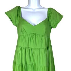 Features: Green poplin. Maxi. Cap sleeves. V-neck. Back zipper closure. 46" from shoulder to hemline.