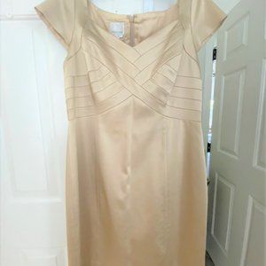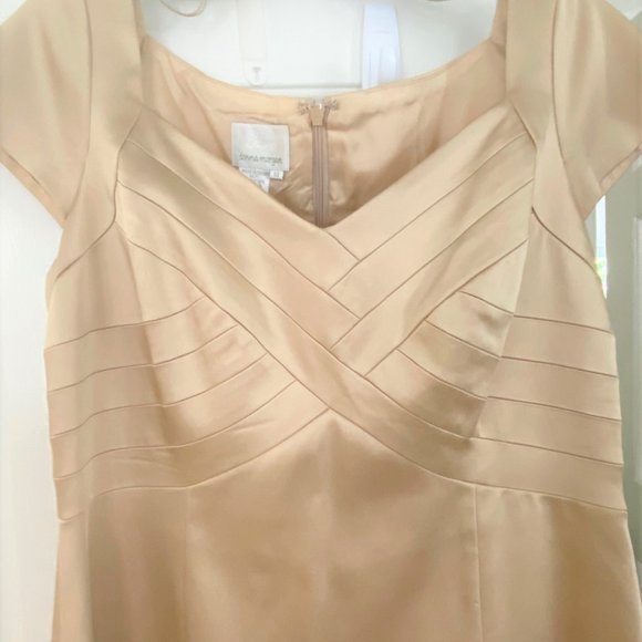 Beautiful Gold Dress completely lined. Size 14. Donna Morgan designer. Very Flattering Dress. V neck, Cap Sleeves. Shoulder to Hem is 39". Arm Pit to Arm Pit is 20" Back Zipper. Gently loved dress in very good condition from smoke free home.