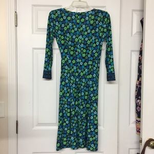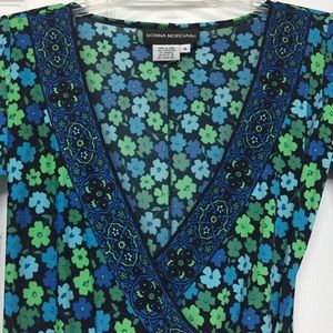 Gorgeous dress with floral pattern in beautiful shades of blue and green. 3/4 sleeves. Contrasting band at neckline and end of sleeve. Very soft and comfortable. Faux wrap look.