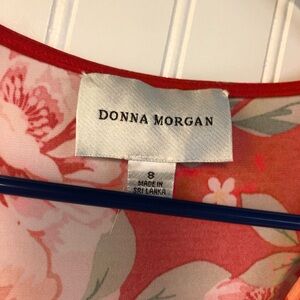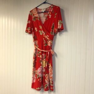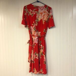 Donna Morgan Floral Faux Wrap Dress Red Size 8 Short Sleeve Stretch Tie Waist
