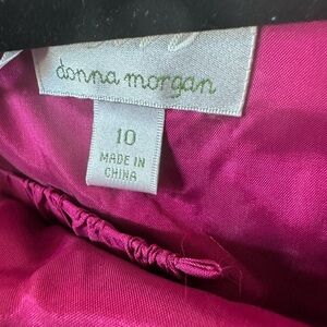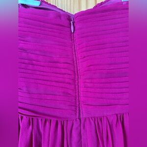 Chic strapless dress by Donna Morgan. Features a vibrant fuchsia hue. Perfect for elegant occasions. Has a few marks in the fabric that look like indentations. Has a zipper in the back and is non slip around the top.
