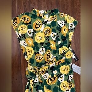 Bold floral pattern dress, with an asymmetrical skirt, and gathered waist detail with metal ring trim.