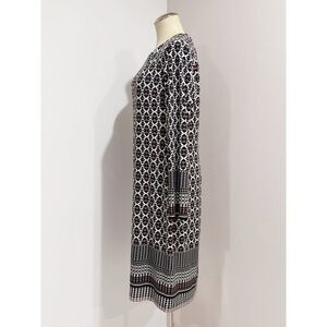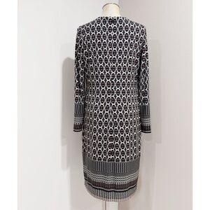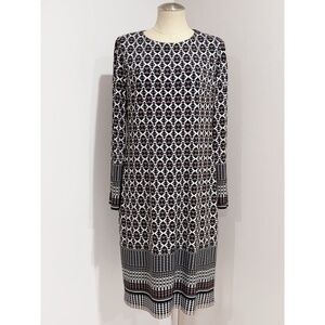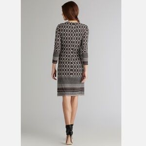 This dress features a geometric print in sable, taupe, and multi-color tones. It has a round neckline, long sleeves, and a sheath silhouette.The material is a stretch jersey fabric