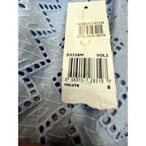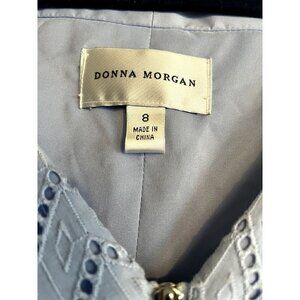 Donna Morgan Light Blue Sleeveless Fit and flare Dress. Size 8, Eyelet Design. Bottom of dress is slightly pleated. Dress is fully lined. Armpit to armpit measures 18 1/2", the length is 36". The shell is 100% cotton and the lining is 100% polyester. Machine washable or dry clean. Pre-owned, but still has the tags attached. Like new condition.