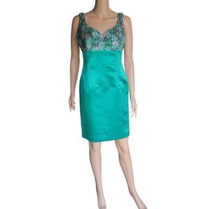 Beautiful green color, floral lace detail, sweetheart neckline, sleeveless, mini, zipper closure, pull-on, lined. In excellent pre-owned condition. Please see all photos for additional details on condition.