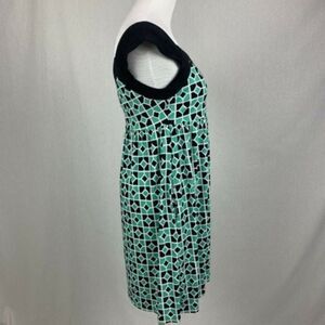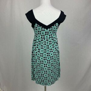 Donna Morgan women's vintage 90s look mod geometric printed short sleeve dress. Green tile pattern with black border and cap sleeves. Sweetheart neckline. Short mini length with empire waist. Size 6