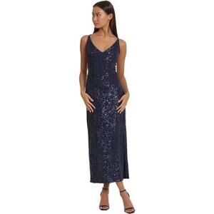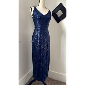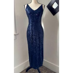 Donna Morgan Navy Blue Sequin V-Neck Midi Dress Womens Size 2 Formal Slit