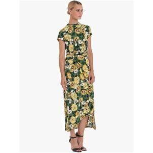 Bold floral pattern dress, with an asymmetrical skirt, and gathered waist detail with metal ring trim.