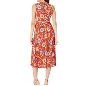 Bring timeless elegance to your summer wardrobe with this stunning red floral pleated midi dress by Donna Morgan.