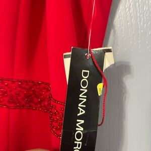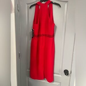 This striking red sheath dress by Donna Morgan features a sleeveless design with a halter neckline, perfect for cocktail events. The structured fabric and streamlined silhouette offer a sophisticated look, while the backless detail adds a touch of allure.
