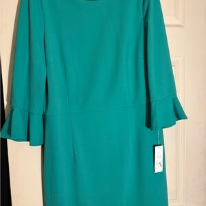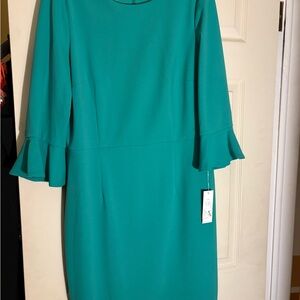 Chic teal dress with stylish flared sleeves. Ideal for any event.