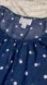 Elegant blue dress with white polka dots. Features black lace accents. Ideal for formal occasions.