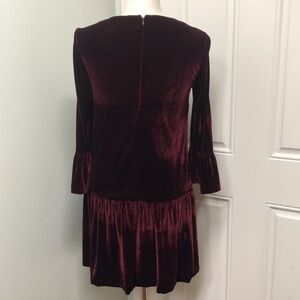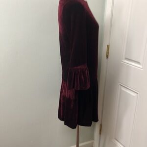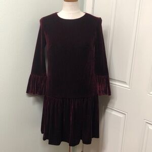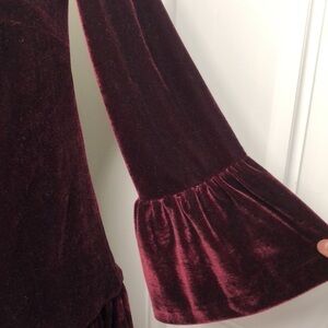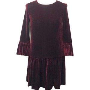 Excellent condition no stains rips or fading. Dark red burgundy colored velvet dress with 3/4 length bell sleeves and ruffle drop waist. 18oz