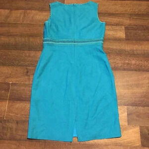 This vintage Donna Morgan dress is a stunning piece that will make you stand out in any occasion. The dress features a beautiful floral pattern that is delicately embroidered on a linen blend fabric. The sleeveless sheath style is perfect for warmer weather and the knee-length cut adds a touch of sophistication.The dress is a size 4P and has a zip closure for easy wear. It is dry clean only and comes in a gorgeous green color. Whether you're traveling, going to a casual outing, or attending a business meeting, this dress is sure to impress. The designer, flower, 70s, and 80s themes make it a unique and stylish addition to your wardrobe.