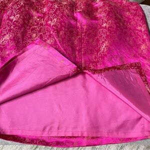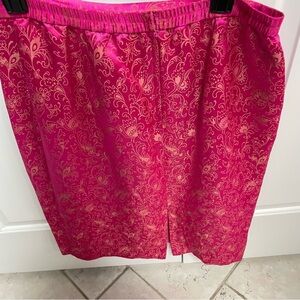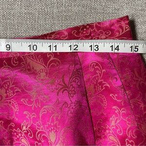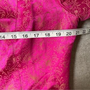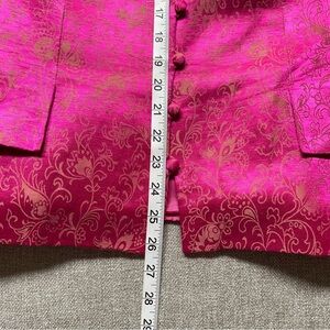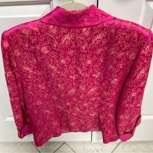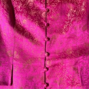 A beautiful vintage silk suit in the most amazing raspberry color way with a burnished gold print.