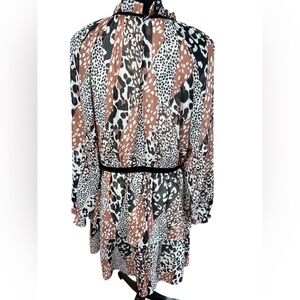 Elevate your wardrobe with this stunning Donna Morgan women’s dress in size US 12 / UK 16 / EU 42. Featuring a bold mixed animal print in warm tones of brown, ivory, and black with subtle metallic gold shimmer, this dress makes a true statement. The fit-and-flare silhouette includes a ruffle-tiered skirt, long sheer sleeves with elastic cuffs, and a flattering black velvet waist belt. Fully lined for comfort. Perfect for cocktail parties, weddings, holidays, and evening events.