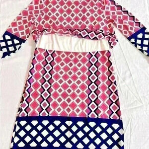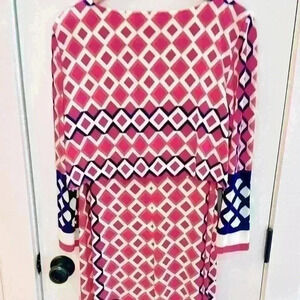 Donna Morgan dress, pretty fuchsia, coral, navy print, sz 10, with drop waist.