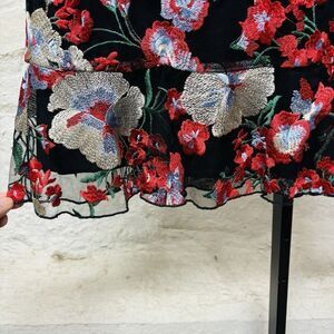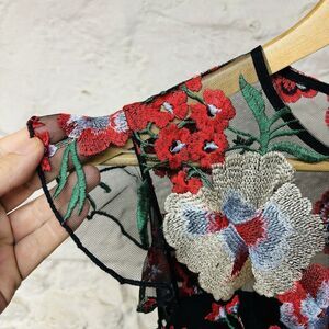 Donna Morgan Black Floral Party Dress Embroidered Sheer Ruffle Sleeve Hem y2k. Sheer embroidered mesh on the outside with black lining.