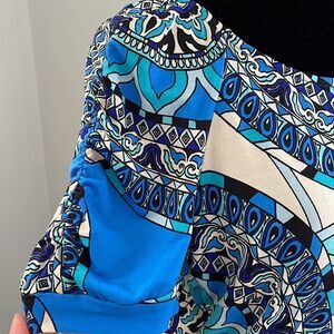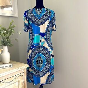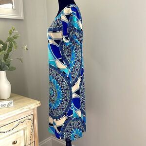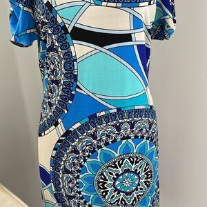 Polyester/spandex Blend. A fun shift style dress that hits just above knees. Short sleeve with ruching.