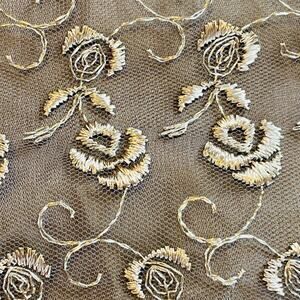 Rich brown lining with golden mesh overlay of embroidered flowers