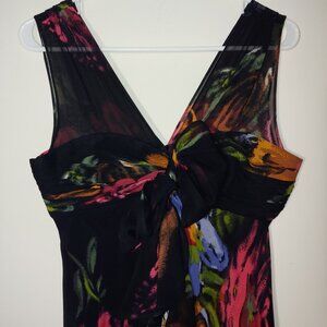 Ruched bust-line with and pretty chiffon layers. Vibrant floral print. Size 8P measurements are approximate