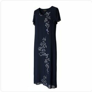 This elegant navy blue dress features delicate floral, perfect for any occasion, especially Mother of the Bride or Groom. The sophisticated design offers a timeless look. A beautiful dress for a wedding or elegant special occasion.