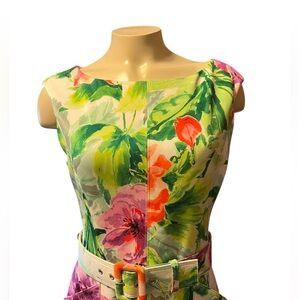 Step into elegance with this Donna Ricco sundress, perfect for a wedding guest or cocktail occasion. The dress features a vibrant green base adorned with a lively floral print, complemented by short sleeves and a flattering scoop neckline. Its midi length and flared skirt add a touch of sophistication to your resort wear collection.It has 2 pockets on the side and a belt.