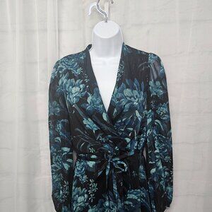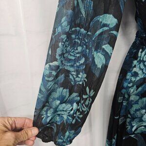 Sheer black shell with a blue floral print and silver metallic threading over a black lining