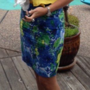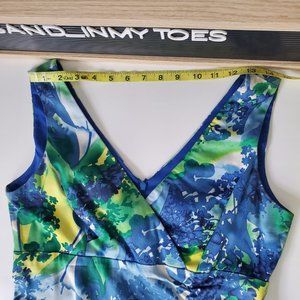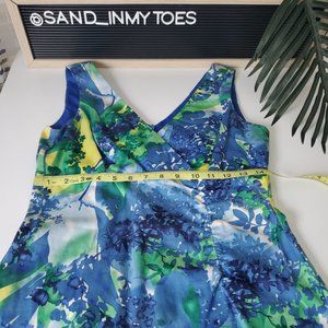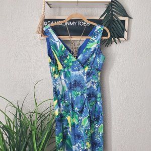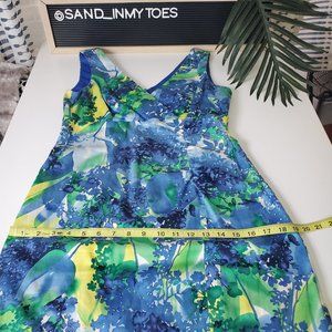 Donna Ricco NY I Sleeveless V Neck Sheath Stretch Summer Dress Teale/Aqua/Yellow Floral Size 4. Lined Upper Bodice. Worn once for a charity event.