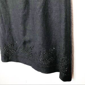 Sheath style dress. Sleeveless. Textured, linen like material. Back zipper. Lined. Laser cut floral designs around the hem. Color is black. Dry cleaned and ready to wear! Size 6