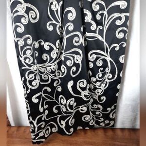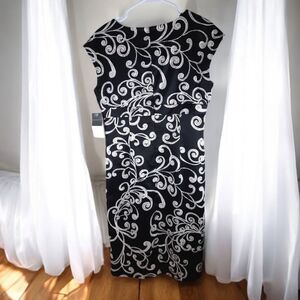 This is an absolutely gorgeous little evening dress that is brand new with tags. This dress is fully lined with a silky black lining, a V-neck design, and a built-in draped belt at the waist. It is sleeveless, has pleated details, and a hideaway zipper down the back for easy on and off. This dress is a size 10 and a midi length and will fall at or just below the knees. The cover photo is AI generated so please see original photos for exact details and measurements.
