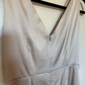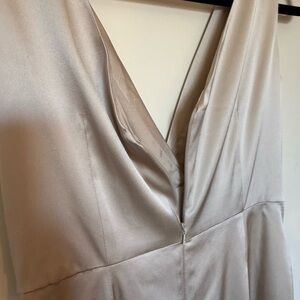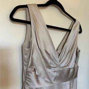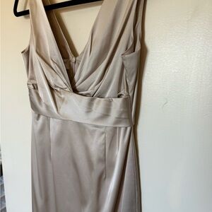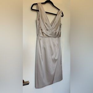 Donna Ricco Petites champagne color sheath dress in size 6P. Wrap style bodice. V in front and back. Hidden zipper up the back. Fabric is comfortable and flattering with a little bit of a stretch. Perfect for a wedding or event.