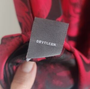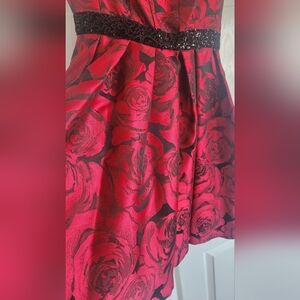Elegant red floral dress with black velvet and sequin attached belt accent. Perfect for special occasions. Zipper closure in the back. And it has pockets!