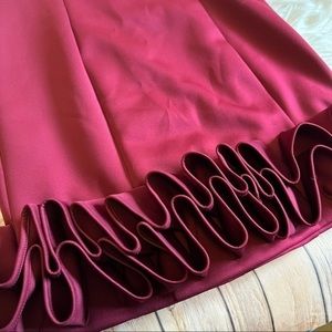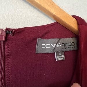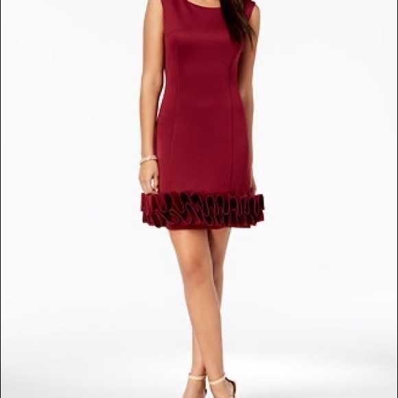 Donna Ricco's elegant sheath dress features an unexpected three-dimensional ruffle at the hem for a unique, modern take on a classic silhouette. Back zipper closure, short length, sleeveless, crew neckline, sheath silhouette, ruffle hem.