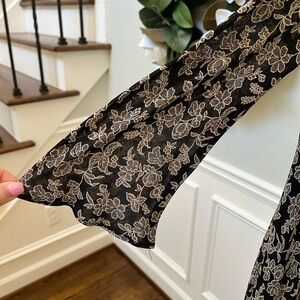 Elegant flowy cowl neck black and white floral midi dress perfect for any occasion. Features a flattering silhouette and comfortable fit. Bell sleeves in comfortable, sheer layered material that is great for the best occasions!