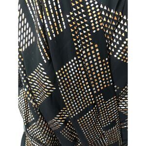 100% polyester, machine wash, gold/silver pattern, lined, pull-over, waist tie, no pockets Shoulder to hem: 54 Chest: 40 Waist: 34 (expands to 38) Event, party, festive