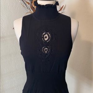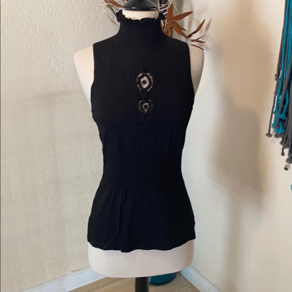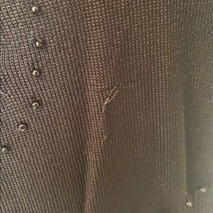 This turtle neck is sexy! I wore this under a sport jacket and got endless compliments and head turns. Sleeveless. One small pull in front.