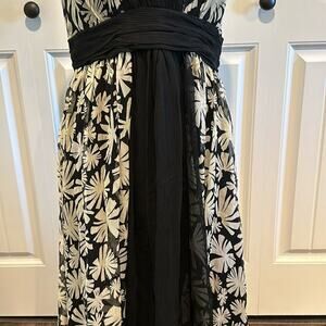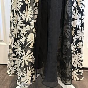 New with tags attached (NWT) Donna Ricco silk halter dress. This piece is not flawless due to the delicate silk so there are some areas on bodice where strands have separated, etc. these are not visible unless examining closely due to the pattern of the dress. Areas of concern are shown in photos, dress is excellent condition but is not completely flawless. Fully lined dress with overlay 100% silk in black and cream, a classic and timeless piece. Pattern is a simple abstract floral pattern in cream against solid black base. Dress has a v-neckline and open back with a halter style silk tie at back of neck that is fully adjustable to desired length. Trim along neckline, at waist and down center in solid black silk provides a slimming effect and is very flattering. Zipper entry in back.
