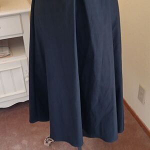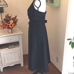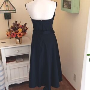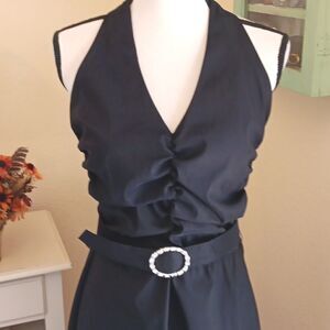Made in the USA. This V neck has ruching in the front and on the side. Crisp faffeta like fabric. Halter necknwith sparkly button a the back neck. Midi length. Semi-full skirt. Fully lined, back zip. Size 10 measures 34-38 at chest, 28-32 at waist, 44 at hips. 44 long from shoulder to hem. The belt has an oval rhinestone buckle. This is a beautiful statement for your special occasion.