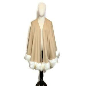 Donna Salyers Fabulous Furs Faux Fur Trim Tan Knit Open Cape Poncho Shawl OS