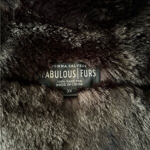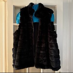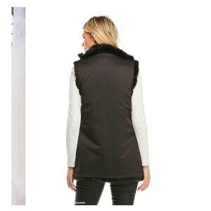 Donna Salyers black mink reversible faux fur vest . Has a double sided zip closure . Stand up collar, welt pockets on weather repellent side & hidden pockets on faux fur side . Water - repellent shell reverses to faux fur side . It’s a figure flattering vest with coverage on back . PTP 25” length 32” ! Good condition! ! Currently in her catalogue, purchased directly from site & original owner.