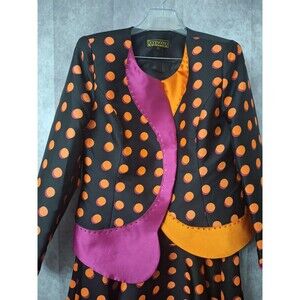 The product is a colorful 2-piece Donna Vinci polka dot skirt suit in with rhinestone trim size 12, perfect for various occasions such as weddings, parties, or business events. Made of satin fabric with a vibrant multicolor pattern, this suit is both lined and lightweight, making it versatile for all seasons. The jacket features a five-button front closure and a colorful design that adds a fun and unique touch to the outfit. The skirt and jacket are designed for a regular fit, offering a stylish and comfortable option for women looking to make a statement with their outfit choice. Has a few food stains on the front of the jacket. SEE PHOTOS!!! PTP 21 in. Length 27 in. Waist 32 in. Skirt length 38 in.