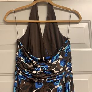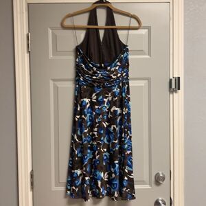 Donna Morgan Brown, White, and Blue Floral Halter Dress