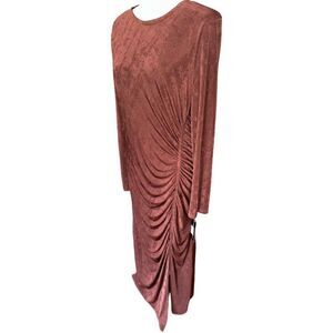 Crew neck, long sleeves, curved princess seam with ruching, and an ankle length skirt with a front slit.
