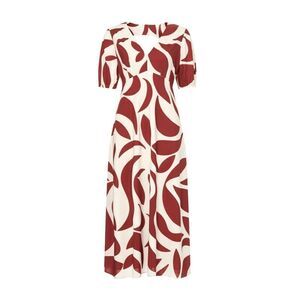 Red printed polyester blend (97% Polyester, 3% Spandex). A-line. V-neck. Short sleeves. Back button closure. 50.5" from shoulder to hemline.