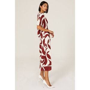 This classic midi dress from Donna Morgan is updated in a deep maroon abstract print.