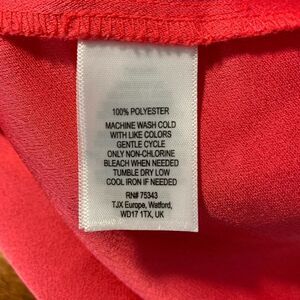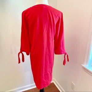 NWOT Donna Ricco hot pink shift dress with long sleeves and tied cuffs, v-neck front and overall stretch. Armpit-to-armpit 20”, sleeve 18”, waist 40” and length 38”.