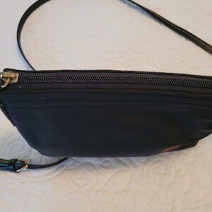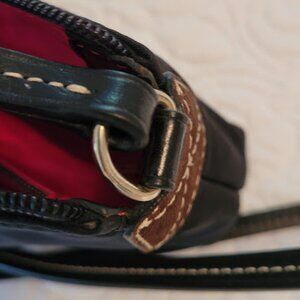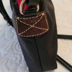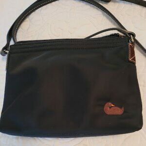 Vintage Dooney & Bourke, nylon, color black with pink lining, cross body, mini pouchette. Top zip close, adjustable strap, inside 1 zip pocket, 3 open pockets, 1 pen pocket. In excellent condition, used only a couple of times, has been stored in a box -- pink lining is clean, strap has no stiches missing, no signs of wear or cracking, no stains or damage to the nylon. The gold zipper to close the purse has started to discolor due to age. Other gold hardware is in excellent condition. Measures about 8.5" x 6" -- strap is 25" long from center.