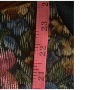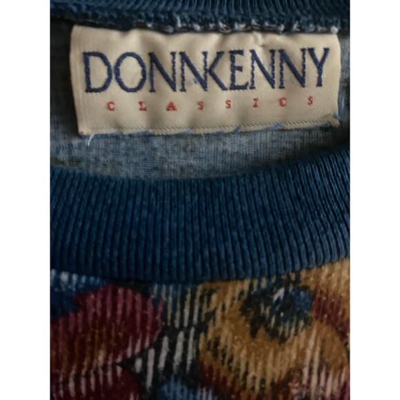 This vintage Donnkenny floral pullover sweatshirt is a charming nod to retro 90s fashion. Showcasing a bold multicolor floral pattern accented with blue ribbed cuffs and collar, this pullover is both stylish and cozy. Perfect for casual wear or as a unique vintage piece in your wardrobe, its relaxed fit and vibrant design make it a standout item for any retro fashion lover.